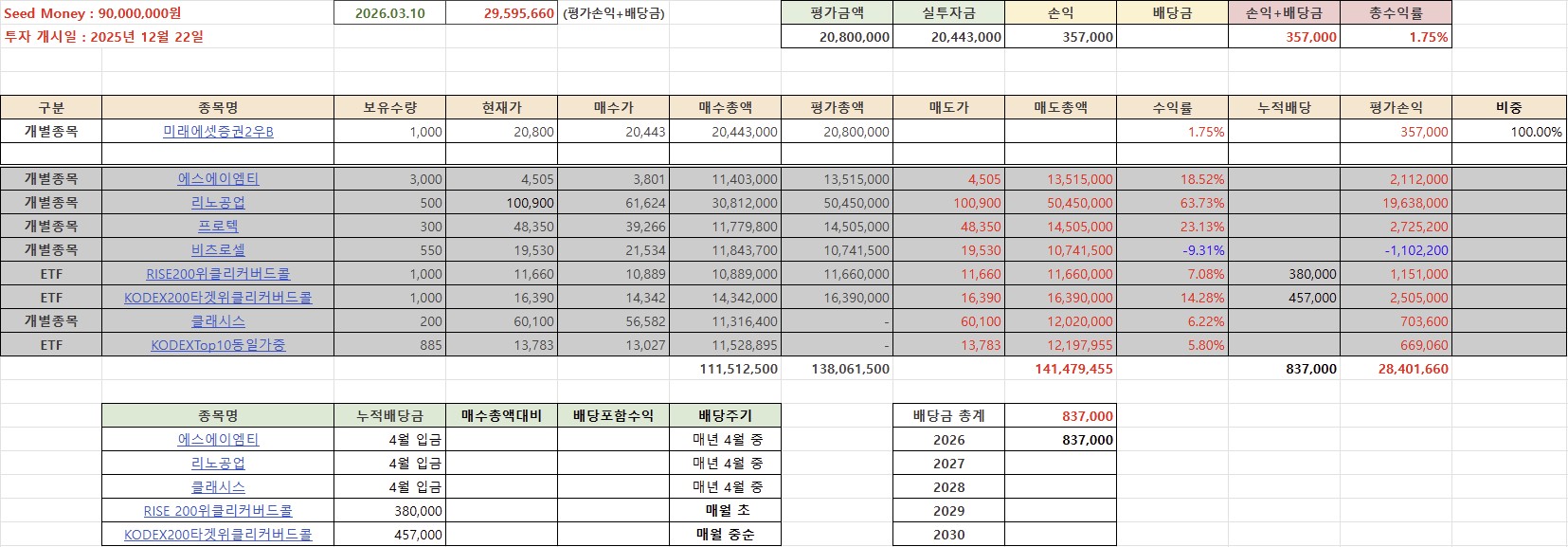 미래에셋증권2우B 추가 매수 (1,250주) 매수 사유 : 3월 10일 최초 매수 사유 + 배당 미래에셋증권의 2025년 결산 배당은 현금배당과 자사주를 활용한 주식배당을 병행. 배당기준일은 3월17일, 3월24일 정기 주주총회 승인 후 1개월 이내에 현금과 주식 지급 예정. 미래에셋증권의 현금배당은 보통주 기준 주당 300원, 총 약 1744억원을 지급.주식배당은 보통주 1주당 0.0073206주, 총 425만5568주를 지급. 약 2,909억원(보통주 기준 500원 상당 주식)에 해당. 현재 불안정한 시장 상황 상 배당을 통해 어느 정도 수익을 확보하면서 추가 상승을 기다려 보려고 한다.